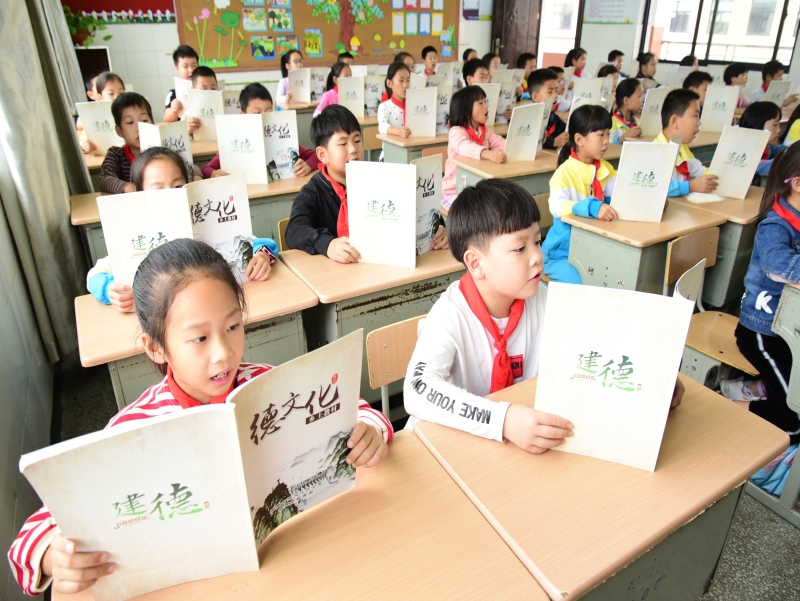 10月10日,壽昌第一小學的孩子們正在誦讀鄉(xiāng)土教材“德文化”。 今年以來,該校為全校1000多名學生專門頻發(fā)了《德文化》讀本,讓孩子們學習德文化,從小培養(yǎng)良好的品德。 (記者 寧文武)