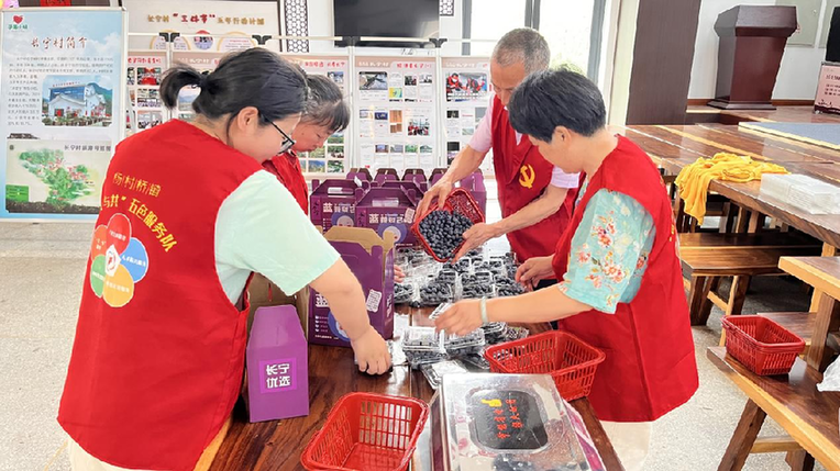 圖為建德市楊村橋鎮(zhèn)長寧村黨員志愿者在包裝藍莓