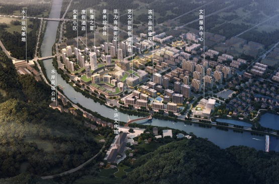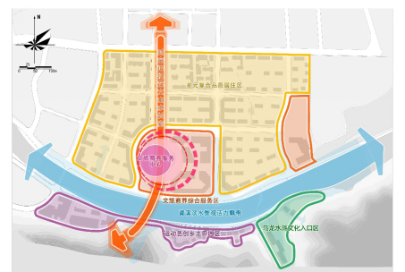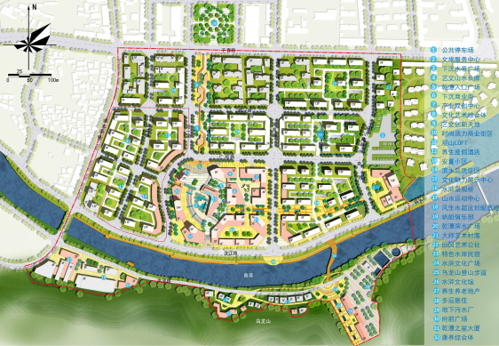 四區(qū)輝映:指文旅商養(yǎng)綜合服務(wù)區(qū)、多元復(fù)合品質(zhì)居住區(qū)、運(yùn)動(dòng)藝創(chuàng)鄉(xiāng)土田園區(qū)以及烏龍水滸文化入口區(qū)。