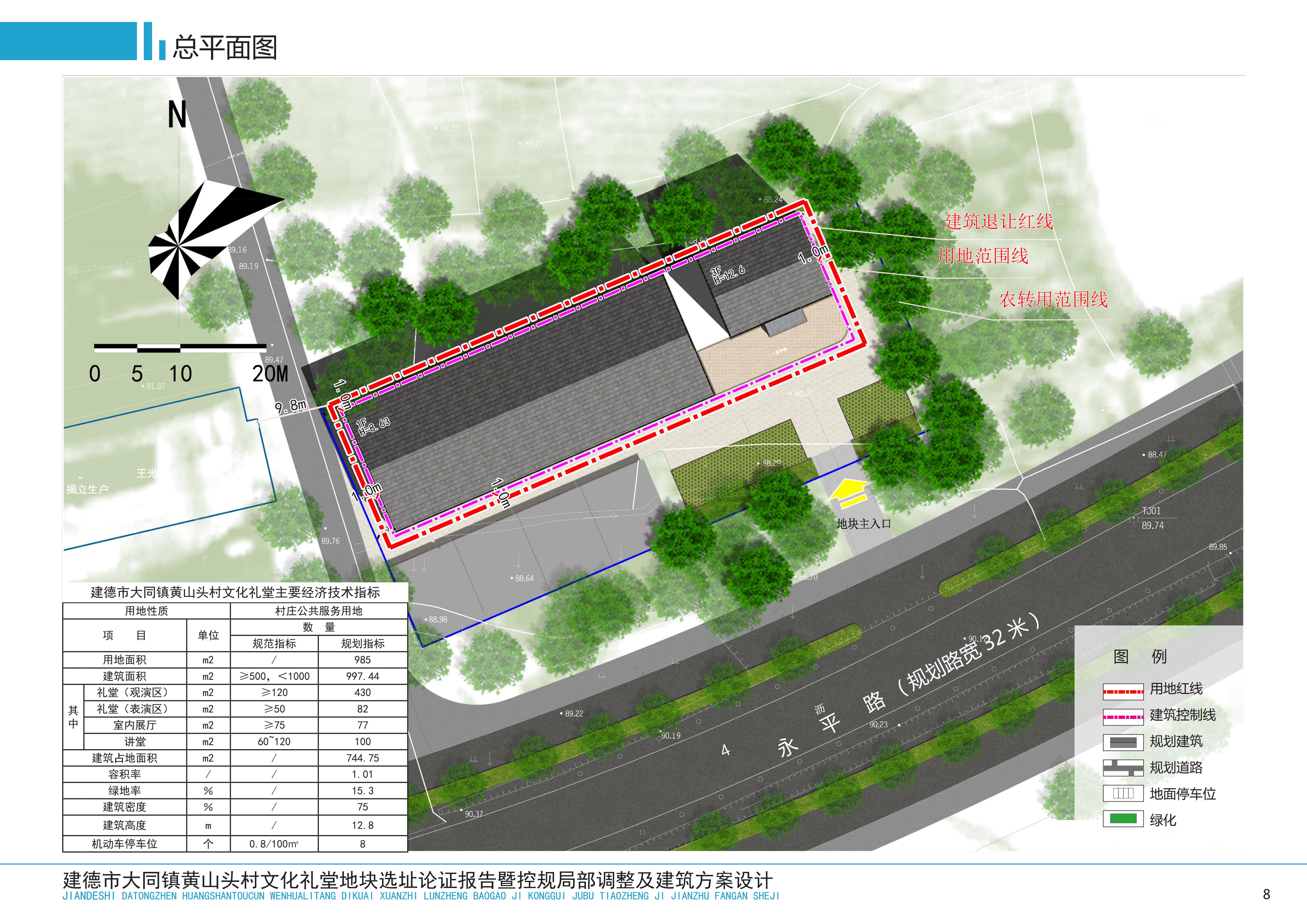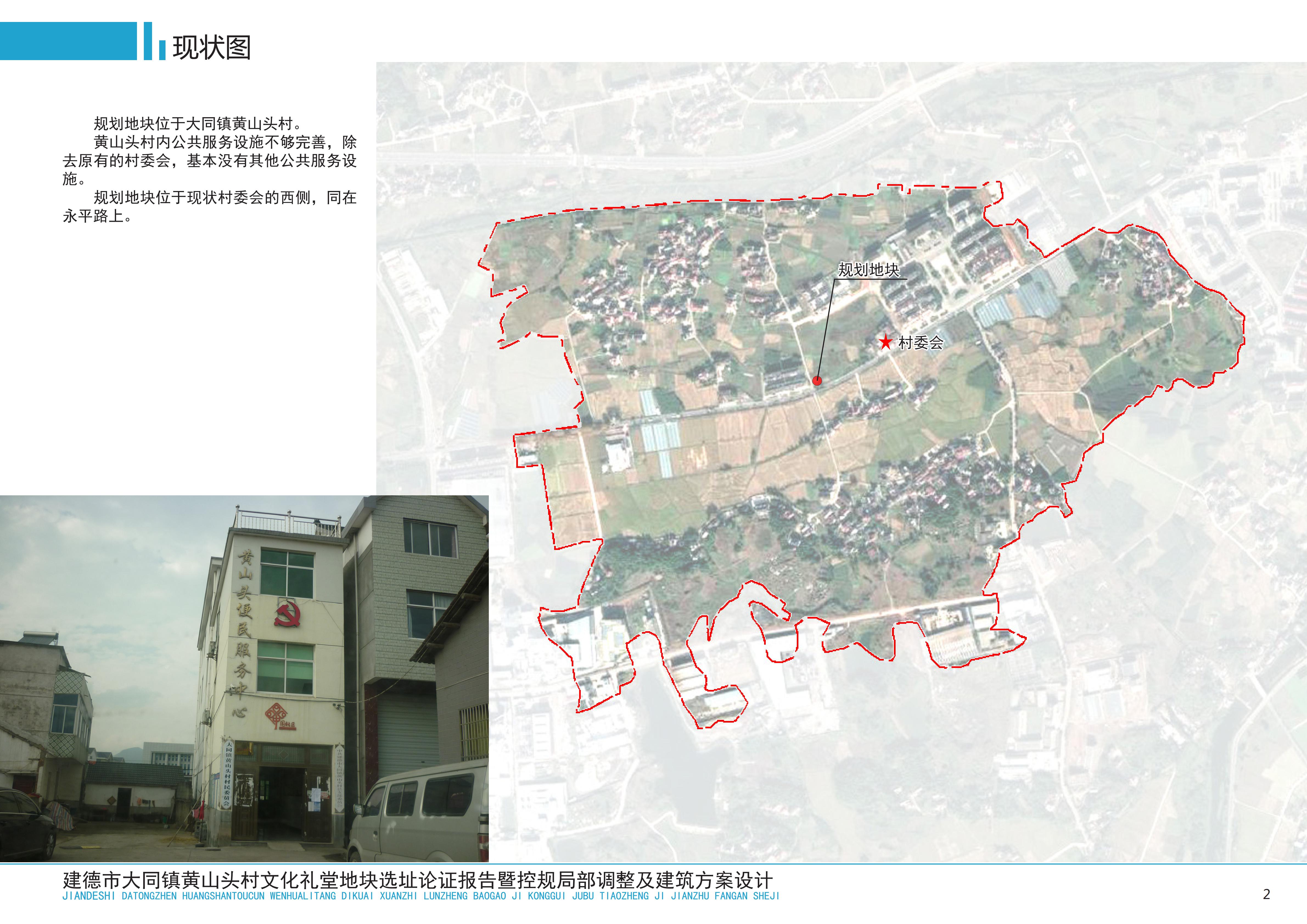 本項目基地位于大同鎮(zhèn)黃山頭村。規(guī)劃用地性質(zhì)為文化活動用地(A22),總用地面積為985㎡,容積率≤1.0,建筑密度≤75%,建筑限高≤15米。