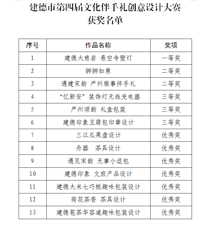 根據(jù)《建德市第四屆文化伴手禮創(chuàng)意設(shè)計大賽方案》相關(guān)要求,自2023年11月啟動建德市第四屆文化伴手禮創(chuàng)意設(shè)計大賽工作以來,共征集到52件作品,經(jīng)組織海選、專家評審,確定13個文化伴手禮創(chuàng)意設(shè)計大賽獲獎作品,其中一等獎1個、二等獎2個、三等獎3個、優(yōu)秀獎7個,現(xiàn)將獲獎名單予以公示。公示期為2024年5月13日至5月17日。
