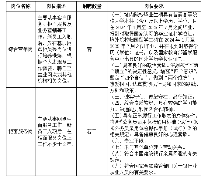 自1954年10月建設(shè)銀行成立至今,70年來,青春建行者們,始終緊隨生生不息的時(shí)代脈動,踐行“國之大者”的初心使命,中國建設(shè)銀行2025年度校園招聘正式啟動,現(xiàn)將招聘有關(guān)事項(xiàng)公告如下: