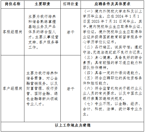 中國(guó)農(nóng)業(yè)銀行股份有限公司建德市支行因業(yè)務(wù)發(fā)展需要,現(xiàn)向境內(nèi)外院校2024年、2025年大學(xué)本科及以上學(xué)歷畢業(yè)生公開(kāi)招聘客服經(jīng)理、客戶經(jīng)理若干名,并就有關(guān)事項(xiàng)公告如下: