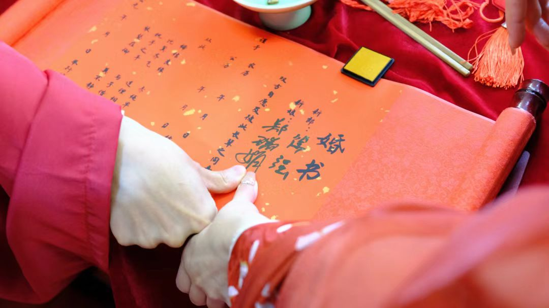 新郎射雁為聘,新娘身著嫁衣,以扇遮面,行沃盥、交拜、同牢、合巹、結(jié)發(fā)之禮。為推進建德市婚俗改革試點工作,進一步深化移風(fēng)易俗,營造文明和諧的新風(fēng)尚,5月20日,建德市民政局舉辦了一場沉浸式體驗傳統(tǒng)婚嫁風(fēng)俗和“三書六禮”的婚嫁儀式,4對新人作為引領(lǐng)建德婚俗新風(fēng)的青年代表參與本次集體婚禮。