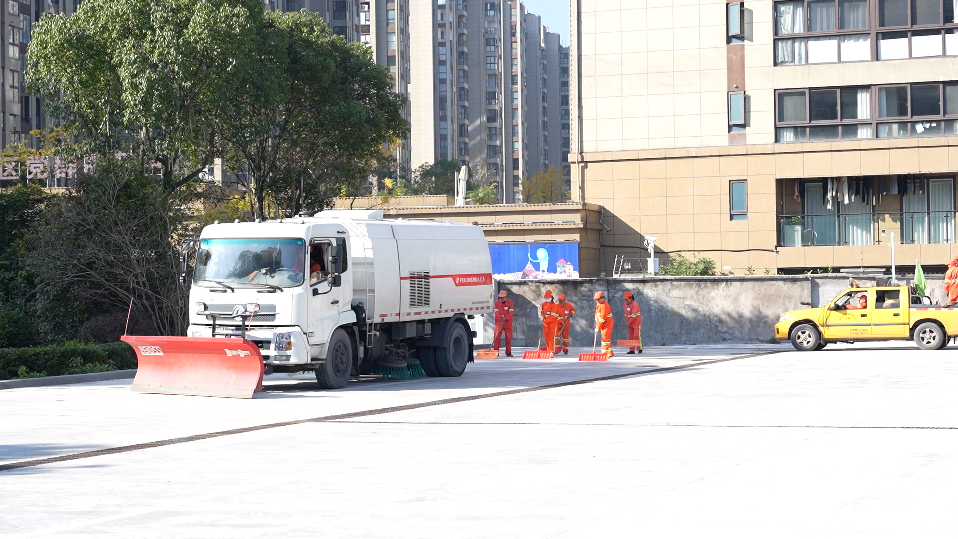 掃雪車、裝載機、高壓沖洗車和清掃車等大型車輛快速調(diào)度集結(jié),運用融雪劑、工業(yè)鹽草墊、鐵鎬對剩余的路面冰渣進行清除,配合機械設(shè)備人工除冰,保障路面行車安全。建德市城區(qū)夜間因低溫寒潮天氣開始降雪,凌晨新安江街道路面和橋面已產(chǎn)生厚度達6厘米的積雪,將對早高峰的行人車輛交通造成影響。市防指辦實時連線市綜合行政執(zhí)法局除雪隊伍,及時掌控除雪進度,“我們的除雪隊伍共10人,鏟雪車、撒布機、推雪板、草包等配套裝備30余件,正在除雪工作。”除雪隊伍負責人向指揮部匯報表示。應急救援人員駕駛鏟雪車,掃除較厚積雪,裝載撒布機的皮卡車隨后將工業(yè)鹽均勻撒在路面上,加速路面殘雪融化。大型器械清掃后,由人工除雪隊利用推雪板清除邊角較大積雪開辟道路,將積水、碎屑等較小積雪清除,最后迅速將草墊鋪設(shè)在其后,形成一條安全的人行通道,為群眾出行保駕護航。