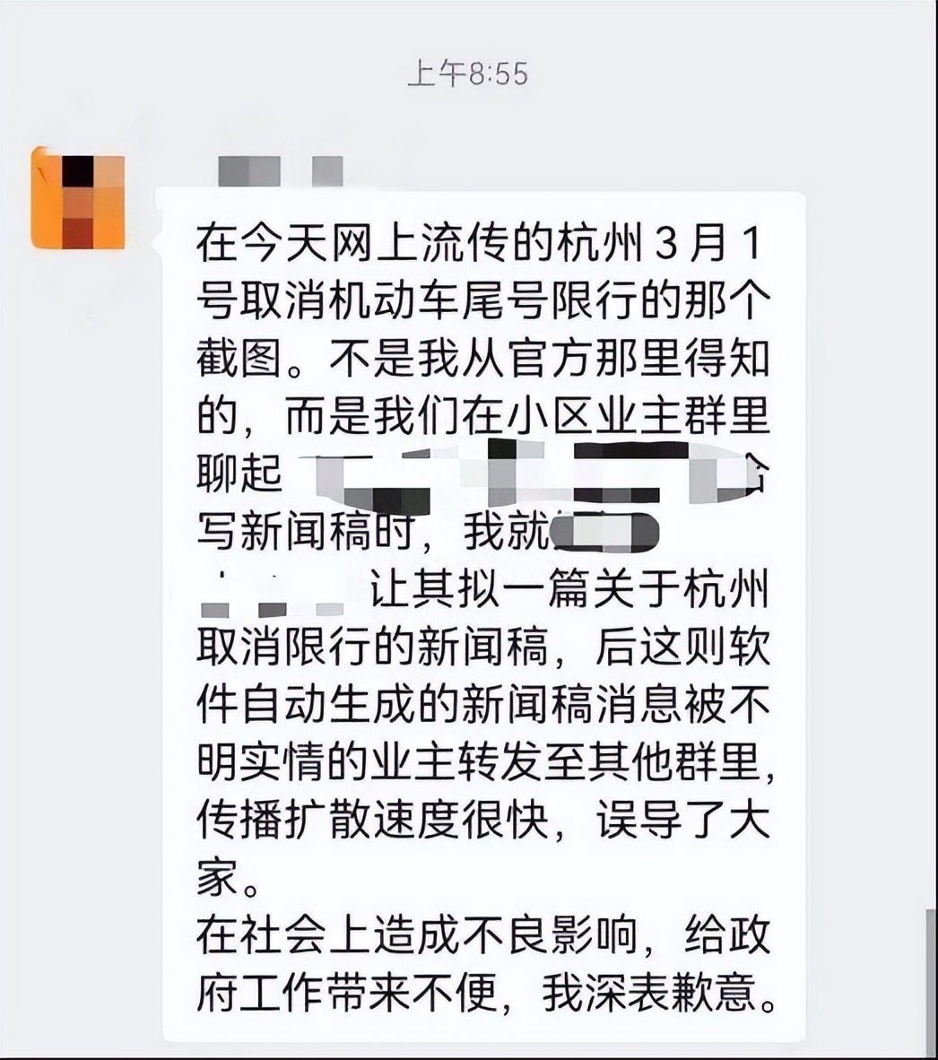 昨天,網(wǎng)絡(luò)瘋傳一條關(guān)于杭州市政府3月1號取消限行的“新聞稿”,經(jīng)清鋒俠聯(lián)合相關(guān)部門調(diào)查核實,該信息為杭州一小區(qū)業(yè)主群內(nèi)討論某人工智能應(yīng)用時,一位業(yè)主嘗試用人工智能技術(shù)自動生成的文字稿件,并在群內(nèi)直播寫作過程,文章被其他業(yè)主截圖轉(zhuǎn)發(fā),導(dǎo)致錯誤信息被傳播。據(jù)了解,警方已介入調(diào)查,涉事業(yè)主已在群里公開道歉。