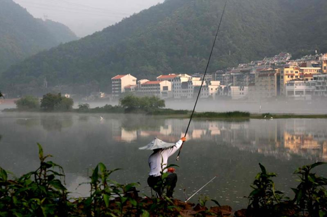奇霧纏綿新安江,山岳山城映碧水。漁翁放竿江畔坐,不釣江魚釣江景。