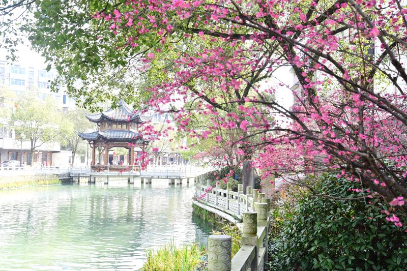 春回大地,花紅柳綠。在壽昌古鎮(zhèn)的西湖橋頭,石橋、樓閣、涼亭在艷麗的梅花簇?fù)硐?,更顯韻味。近年來,壽昌鎮(zhèn)加大古鎮(zhèn)街區(qū)道路、河道、街面的生態(tài)建設(shè)和常態(tài)化管理,使集鎮(zhèn)中心呈現(xiàn)出古色古香、四季分明、處處皆景的景致。