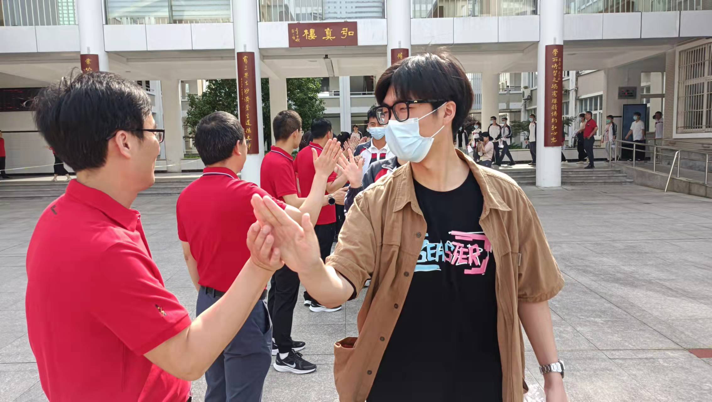 6月7日,2022年高考正式拉開大幕,我市2755名考生走進了全市5大考點95個考場,迎來人生的這場難忘大考。圖為新安江中學的老師們身穿紅色衣服為考生們加油打氣,送上美好祝福。
