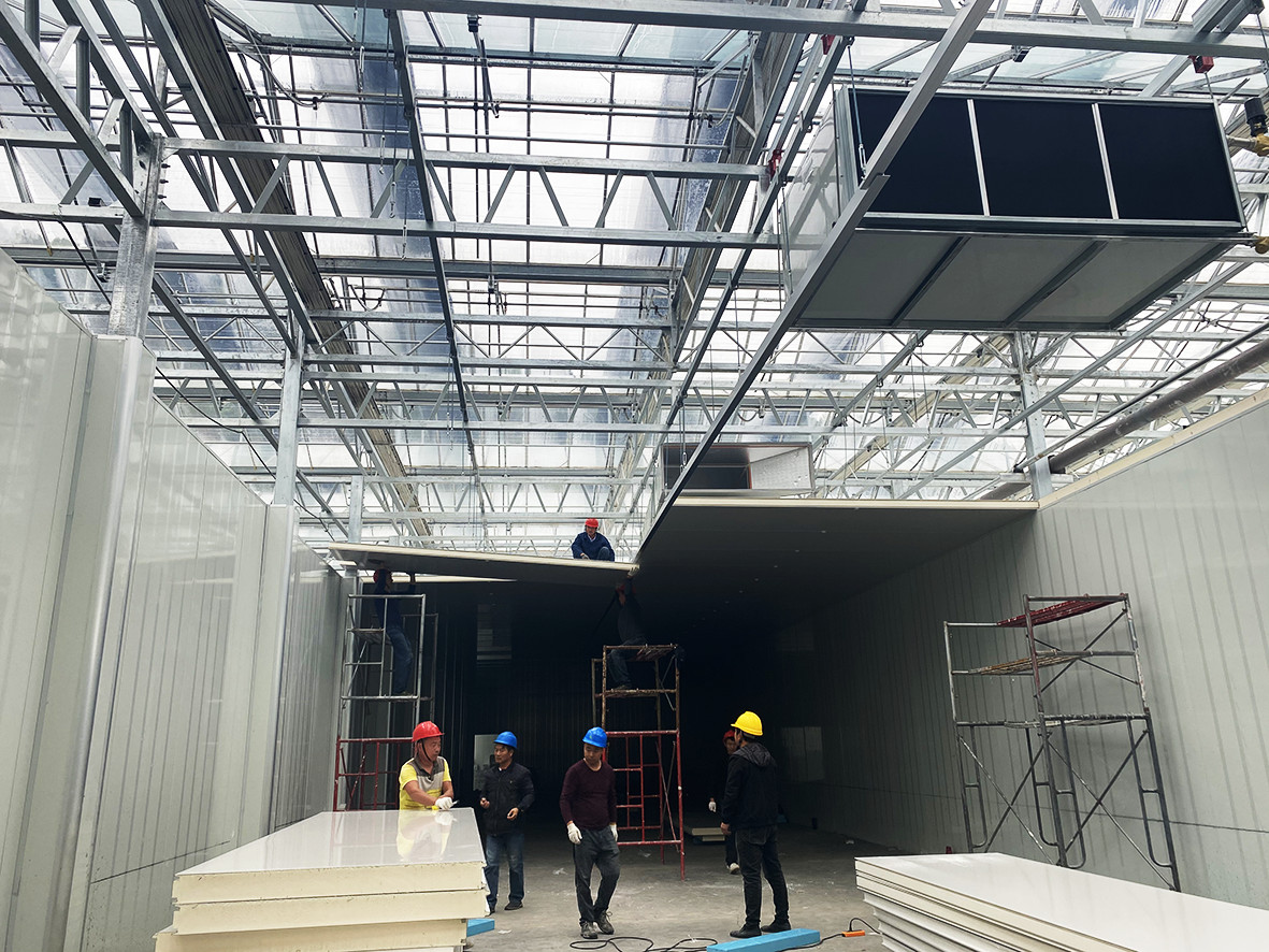 位于緒塘村草莓天空之城正前方的碩大玻璃房?jī)?nèi),建德數(shù)智草莓科研項(xiàng)目已初具規(guī)模,走進(jìn)項(xiàng)目施工現(xiàn)場(chǎng),工人正在搬運(yùn)轉(zhuǎn)移吊頂保溫板、對(duì)吊頂保溫板進(jìn)行拼縫切割、安裝空調(diào)系統(tǒng)設(shè)備?,F(xiàn)場(chǎng)機(jī)器聲、作業(yè)聲不斷,呈現(xiàn)出一派繁忙的施工景象。
