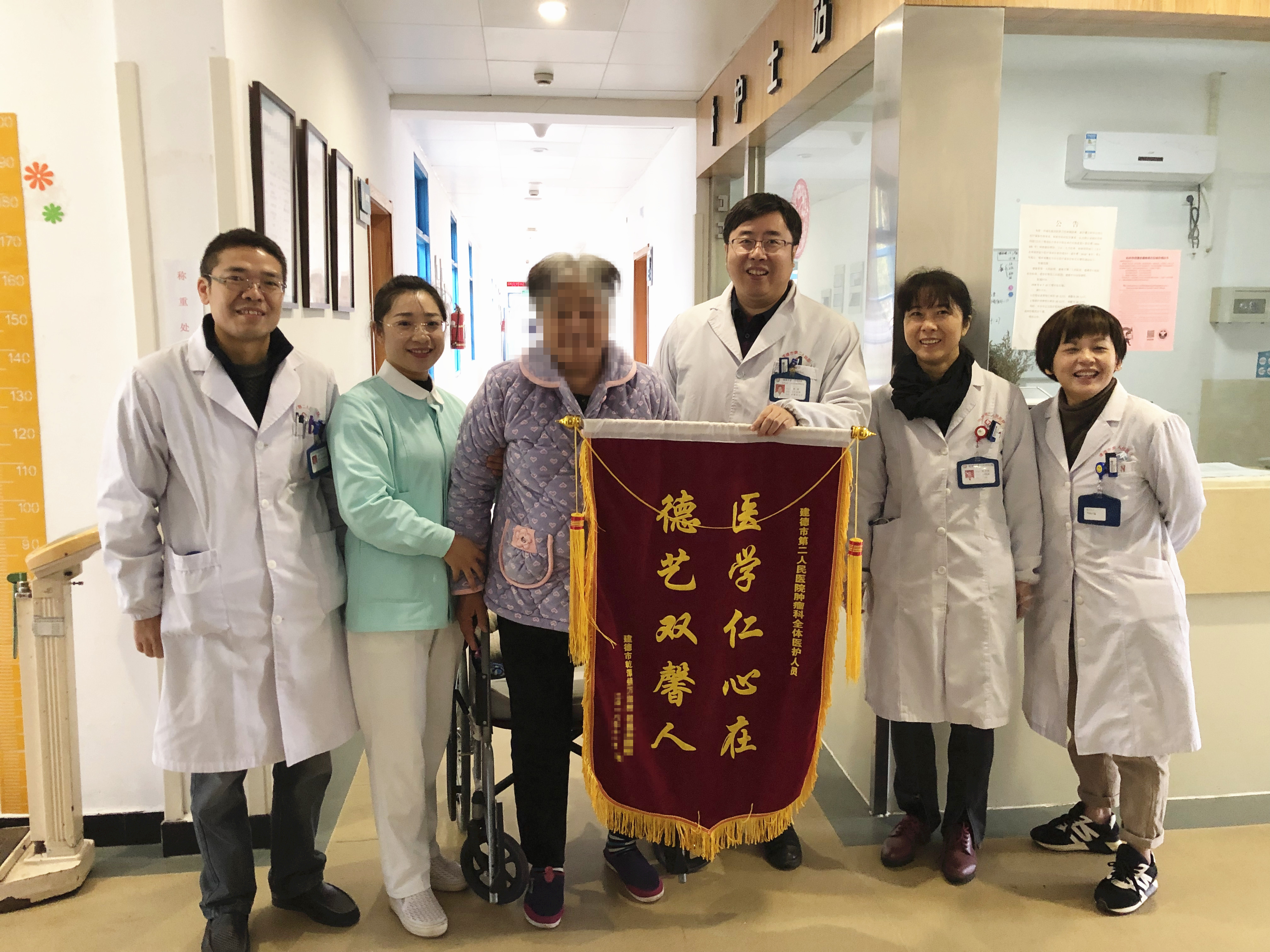 今年3月份朱奶奶因腰背部酸痛就醫(yī)后確診為肺癌骨轉(zhuǎn)移,病情的發(fā)展導(dǎo)致她下肢癱瘓。對于朱奶奶來說這無疑是一個(gè)沉重的打擊,當(dāng)時(shí)的她肢體功能出現(xiàn)障礙,只能長期臥床,插著導(dǎo)尿管,渾身酸痛的她,就連翻身都需要他人幫助,對此,腫瘤科醫(yī)師積極的對癥治療,無論是科主任,還是護(hù)士,都不忘在治療過程中不斷鼓勵(lì)她以積極的心態(tài)對待疾病。醫(yī)護(hù)人員一天幾次至朱奶奶病床前噓寒問暖、觀察病情,對朱奶奶及家人耐心指導(dǎo)其如何積極對待和渡過治療過程中出現(xiàn)的各種反應(yīng)及可能出現(xiàn)的并發(fā)癥,期間朱奶奶行放療,口服靶向藥和止痛藥等等,經(jīng)過順利,效果可,經(jīng)過醫(yī)師的積極治療和護(hù)士的悉心護(hù)理,加之朱奶奶堅(jiān)持不懈的康復(fù)鍛煉,付出的心血和汗水終有回報(bào),從以往的臥床不起,到如今能從輪椅上站起來,扶著助步器行走,不禁讓人感嘆生命的自強(qiáng)不息!目前病情平穩(wěn),朱奶奶及家屬特地送來錦旗表示感謝??粗先撕图覍傺酆瑹釡I的笑臉,腫瘤科醫(yī)護(hù)人員也打心底里為她感到高興。
