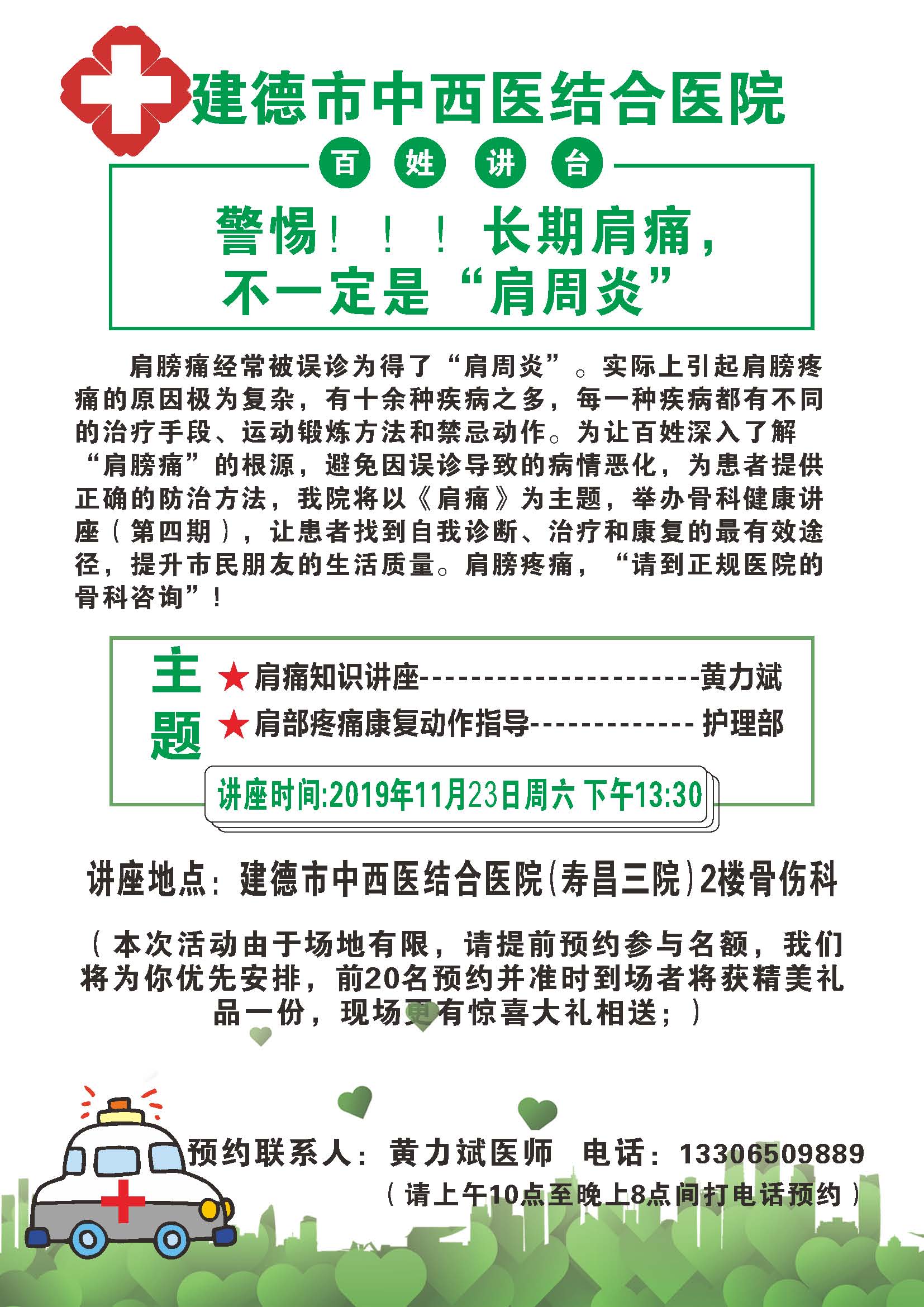 讓百姓深入了解“肩膀痛”的根源,避免因誤診導(dǎo)致的病情惡化,提供正確的防治方法,讓患者找到自我診斷、治療和康復(fù)的最有效途徑,提高生活質(zhì)量?,F(xiàn)定于2019年11月23日下午13:00在建德市中西醫(yī)結(jié)合醫(yī)院住院部二樓骨科病區(qū)進(jìn)行第四期“百姓講臺(tái)”健康講座,屆時(shí)由黃力斌副主任醫(yī)師為大家講解肩痛的相關(guān)健康知識(shí)。同時(shí),還有美小護(hù)現(xiàn)場(chǎng)指導(dǎo)肩部疼痛康復(fù)動(dòng)作。