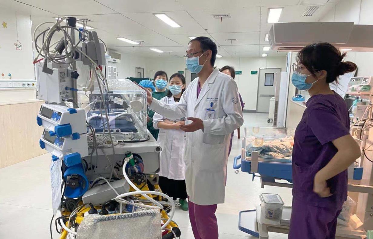 因寶寶存在早產、低體重、呼吸窘迫等多重高危因素,為確保寶寶的生命安全,建議轉至杭州市第一人民醫(yī)院新生兒監(jiān)護中心救治。杭州市一醫(yī)院新生兒科張志群主任得知情況后,專程從杭州火速趕往建德市婦保院親自轉運。15:00順利到達杭州市第一人民醫(yī)院新生兒重癥監(jiān)護病房,生命體征平穩(wěn)。