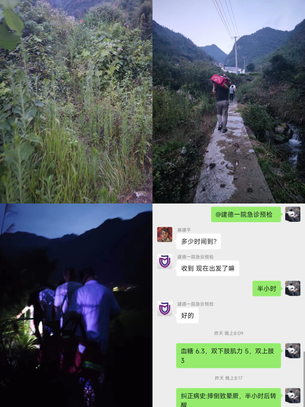 沿著山路尋找近1個(gè)小時(shí)左右,終于在一處田埂下找到該患者,兩位醫(yī)生立刻對(duì)患者進(jìn)行全身檢查。生命體征平穩(wěn),無(wú)惡心嘔吐癥狀,頭部有出血點(diǎn),感全身乏力明顯,自訴暈厥半小時(shí),考慮顱腦損傷,隨即與救援人員一同將患者置于擔(dān)架上。此時(shí)天色已黑,為了積極爭(zhēng)取治療時(shí)間,醫(yī)生同救援隊(duì)一道摸黑抄近路下山,經(jīng)過(guò)緊趕慢趕,半個(gè)多小時(shí)后順利將病人送至120救護(hù)車上,同時(shí)緊急聯(lián)系建德卒中中心工作群,將病人情況進(jìn)行闡述,以便做好接收準(zhǔn)備。