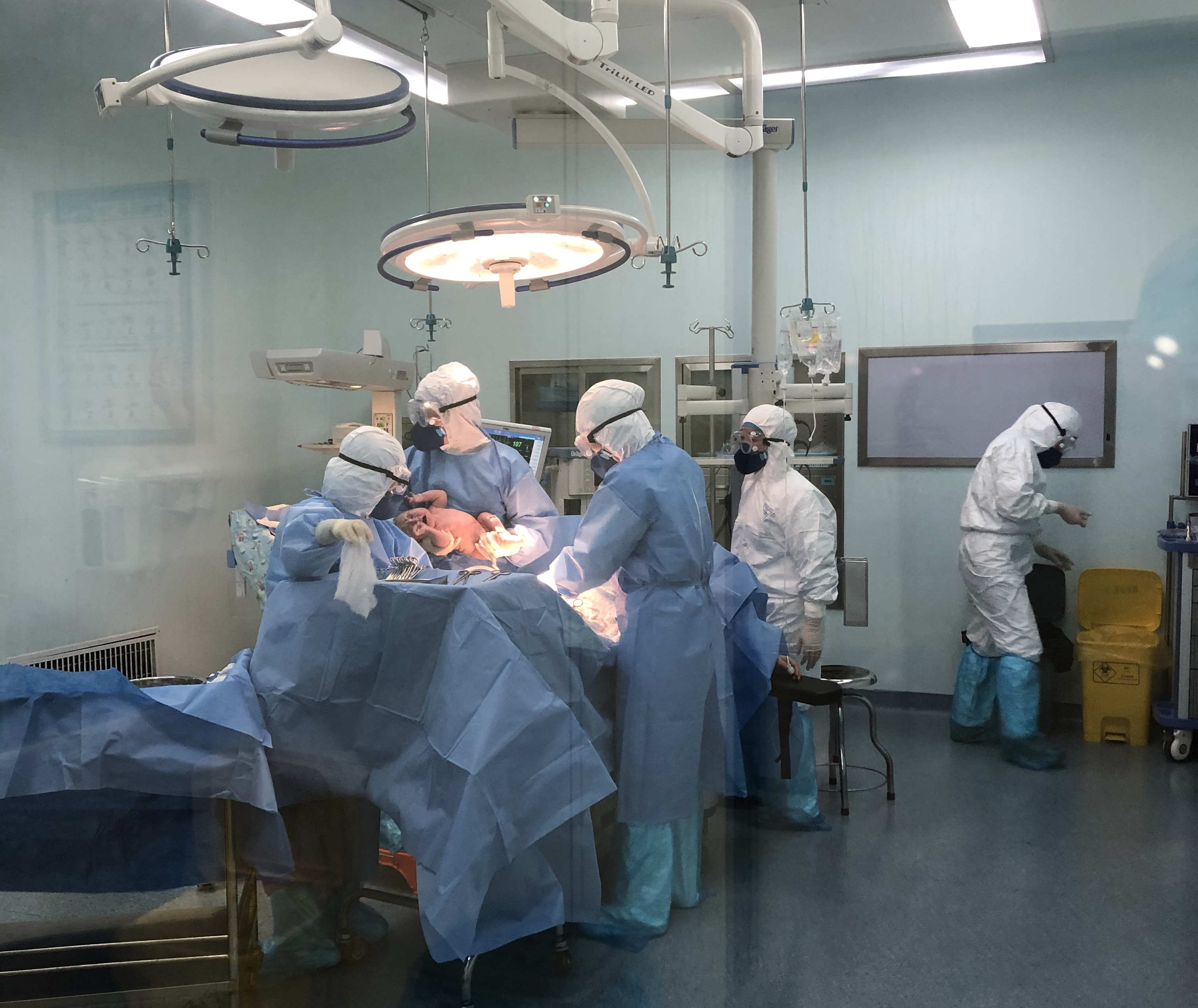 考慮該產(chǎn)婦已妊娠足月,且為二次妊娠疤痕子宮,已有臨產(chǎn)癥狀,需立即行剖腹產(chǎn)。手術(shù)室啟用專用隔離手術(shù)間,麻醉科胡永珍主任做好各項(xiàng)麻醉前準(zhǔn)備。