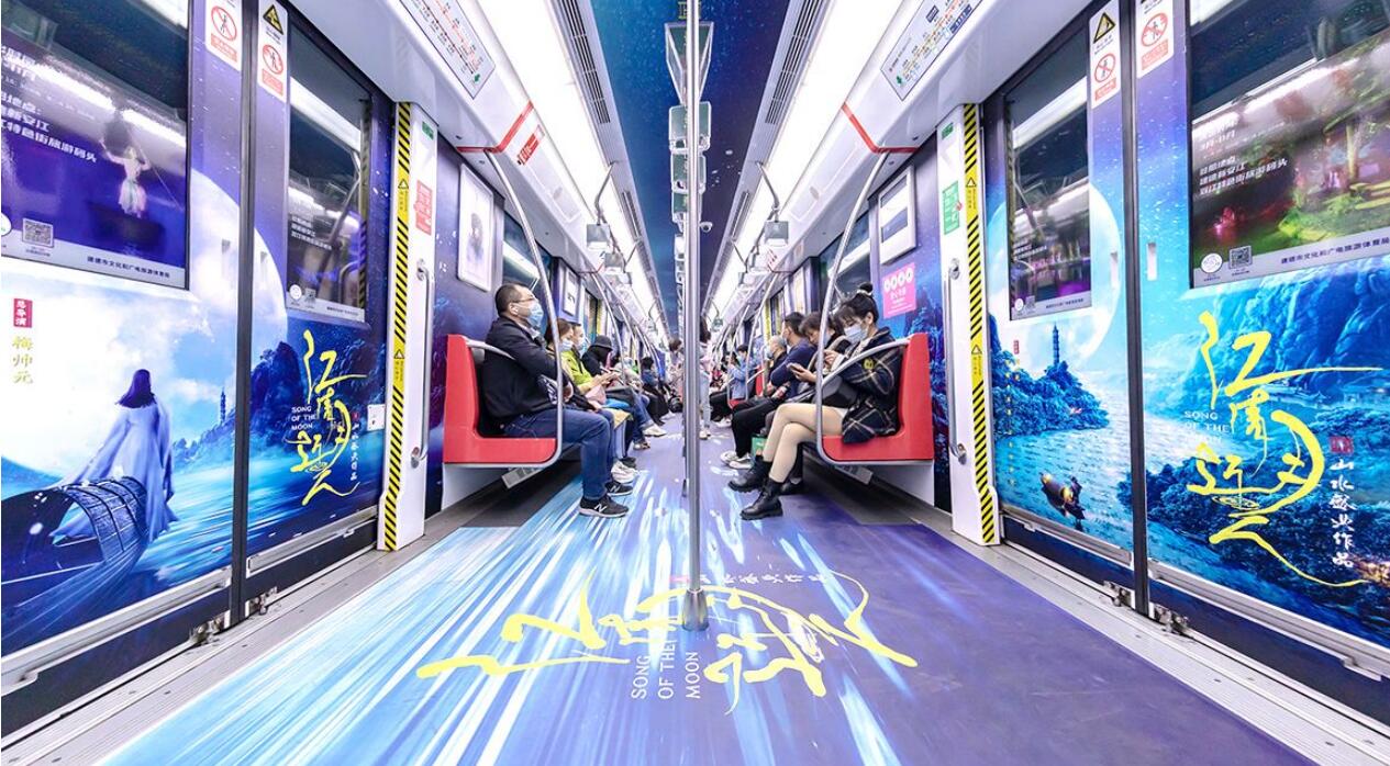 在杭州地鐵開(kāi)行專(zhuān)列是建德旅游營(yíng)銷(xiāo)的亮點(diǎn),我市已經(jīng)連續(xù)開(kāi)行了4年,今年是首次以《江清月近人》旅游新產(chǎn)品作為專(zhuān)列的主題。專(zhuān)列6節(jié)車(chē)廂以深藍(lán)色為主色調(diào),以唐朝詩(shī)人孟浩然旅居建德時(shí)留下的千古名篇《宿建德江》為主題意境,同時(shí)強(qiáng)調(diào)“愛(ài)的原鄉(xiāng),愛(ài)在17”品牌,通過(guò)場(chǎng)景和看板展現(xiàn)“江(逐鹿之初)、清(樂(lè)山樂(lè)水)、月(一路唐詩(shī))、近(風(fēng)中歸來(lái))、人(前世今生)”五個(gè)演出主題劇目。乘客步入專(zhuān)列車(chē)廂,仿佛與古老的“建德人”一起逐鹿于清江花海;隨東漢隱士嚴(yán)子陵寄情山水,獨(dú)釣于大自然四季中;與山水田園詩(shī)人孟浩然、詩(shī)仙李白一同邀月吟詩(shī);體會(huì)戰(zhàn)火紛飛、百姓流離失所下,陳友諒壯志難酬的落寞悲涼;感受親水而居的新安江九姓漁民獨(dú)特的民俗風(fēng)情與他們愛(ài)情故事背后的浪漫。
