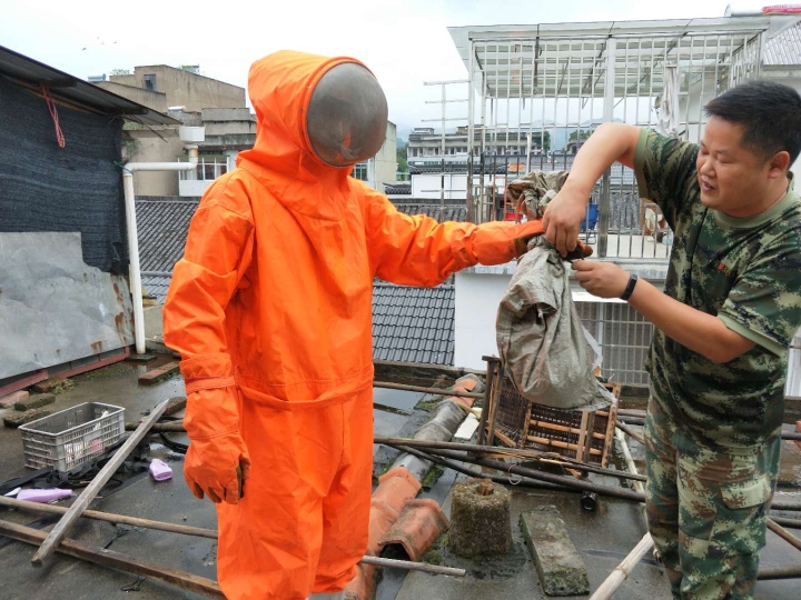 消防隊員到達現(xiàn)場后,只見鐵皮棚下有一個很大的馬蜂窩,飛舞的馬蜂令拆違工作人員和附近居民十分緊張,存在很大的安全隱患。根據(jù)現(xiàn)場情況,消防隊指揮員快速制訂摘除方案,由一名經(jīng)驗豐富的消防隊員穿好厚厚的防化服,準備好塑料袋進行摘除,另外兩名隊員協(xié)助,并做好安全保護工作。消防員穿好防化服小心翼翼地靠近蜂窩,用塑料袋輕輕將整個蜂窩套住摘除。經(jīng)過幾分鐘,該馬蜂窩被順利摘除。(通訊員 方 冰)