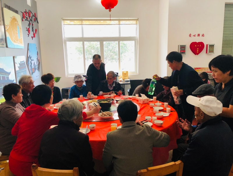 這邊,老人們開心地過著集體生日;另一邊,社區(qū)工作人員忙忙碌碌在準(zhǔn)備著午餐,紅燒肉、蒸肉圓、蒸螃蟹、清蒸鱸魚、羊肉、牛肉、筍干老鴨煲。不一會兒功夫,一盤盤美味可口的菜肴端上了桌,老人們你一筷、我一筷地一邊品嘗著工作人員精心準(zhǔn)備地?zé)釟怛v騰的菜肴,一邊聊家常,歡聲笑語,喜在眉梢。