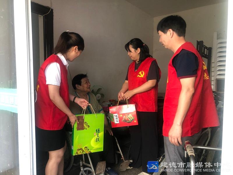 社區(qū)“嚴(yán)大姐”志愿者們?yōu)榕c農(nóng)商行工作人員一同包粽子,為空巢老人、長期臥病在床老人送去節(jié)日的祝福。嫩綠的粽葉,香甜可口的糯米,醬油浸泡過的鮮肉幾樣?xùn)|西通過志愿者們的一雙巧手不一會兒就變成了一只精美的粽子?!棒瞻謨慎?,艾束著危冠。”一只只精巧的粽子精致小巧,發(fā)出陣陣清香。經(jīng)過兩個(gè)小時(shí)左右的蒸煮,粽香四溢,志愿者們提著綠豆糕和粽子來到老人家中為他們送去節(jié)日的問候?!吧鐓^(qū)真好,平時(shí)就很照顧我,逢年過節(jié)也不忘記來看我,心里很暖嘞?!毙袆?dòng)不便的王阿姨拉著志愿者的手開心地說道。