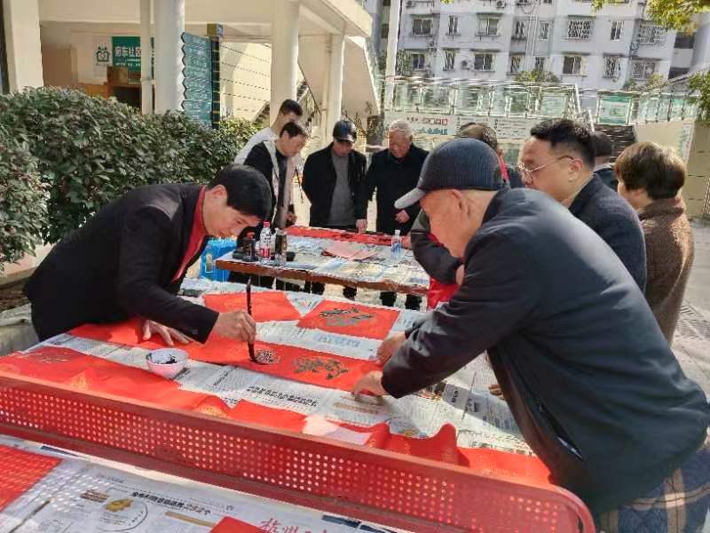小組長樓幢長在升騰起的煙火氣中笑臉盈盈,現(xiàn)場做幸福餅的隊(duì)伍可謂是生意興隆,居民們排成一排排的長隊(duì)前來領(lǐng)取。建鋒書校老師們現(xiàn)場寫春聯(lián),揮灑筆墨間寫下各種新年的美好愿望。志愿者們現(xiàn)場為居民們量血壓、理發(fā)、剪指甲,送上貼心的服務(wù)大餐。新安婆婆家事調(diào)解室組織成員們開展民法典有獎(jiǎng)問答活動(dòng),給居民們普及法律知識。彩帶舞隊(duì)伍、木蘭拳隊(duì)伍等開展迎新春表演,給活動(dòng)帶來更多的歡聲笑語。針織隊(duì)伍用毛線鉤出各式各樣的小掛件,手工隊(duì)伍巧手做出一朵朵小紅花。凍米糖攤位前排滿了顧客,忙著買年貨熱鬧非凡。居民們齊聚一堂前來共品幸福餅,共話新年愿景,和諧而美好。