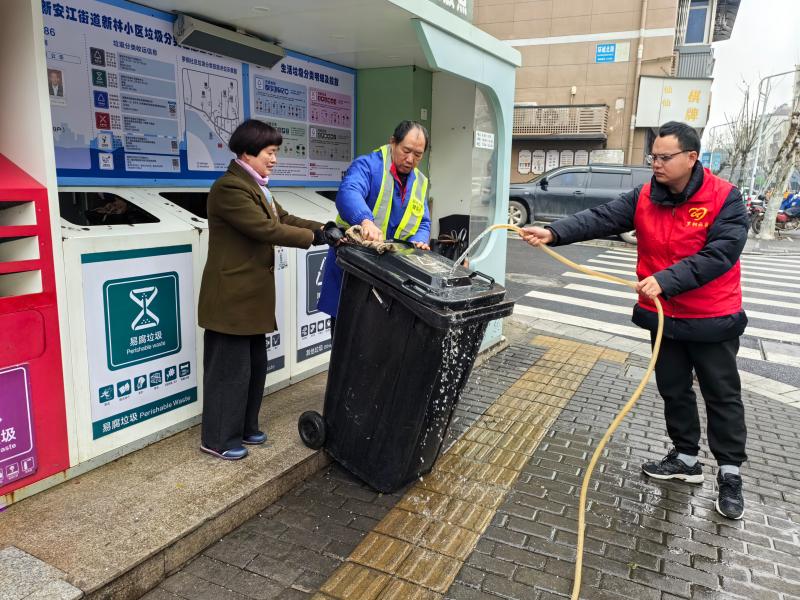 在新林路垃圾分類點位,督導(dǎo)員用清水對垃圾桶進行全面沖刷,對垃圾桶內(nèi)外進行清洗,確保每一個桶干凈整潔,同時對破損桶進行維修或更換。