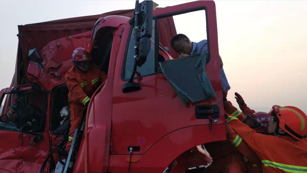 5時44分,建德中隊(duì)到達(dá)事故現(xiàn)場,立即對現(xiàn)場情況進(jìn)行勘察。經(jīng)勘察發(fā)現(xiàn),兩輛貨車車頭相撞,導(dǎo) 致車頭嚴(yán)重變形,一貨車駕駛員被卡駕駛室無法動彈。了解現(xiàn)場情況后,指揮員立即下達(dá)救援命令:第一小組負(fù)責(zé)做好現(xiàn)場警戒,防止二次事故的發(fā)生;第二小組立刻展開救援,利用破拆器材對駕駛座車門進(jìn)行破拆,車門擴(kuò)張開后,再利用液壓擴(kuò)張鉗擴(kuò)大車載臺和座椅的距離,逐步擴(kuò)大救援空間。經(jīng)過約20分鐘的緊張救援,消防隊(duì)員成功救出被困人員,并移交給120醫(yī)護(hù)人員送往醫(yī)院救治。