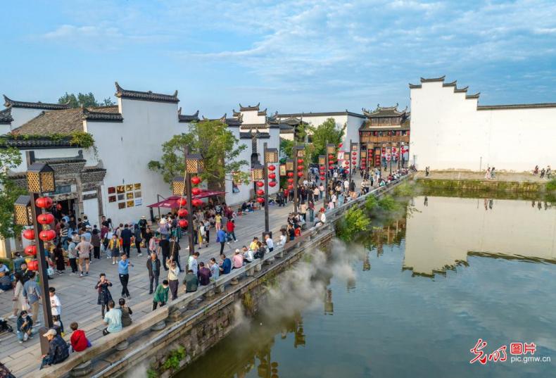 2023年10月4日,游客在安徽省銅陵市義安區(qū)犁橋水鎮(zhèn)景區(qū)游玩,歡度佳節(jié)。(肖本祥攝/光明圖片)