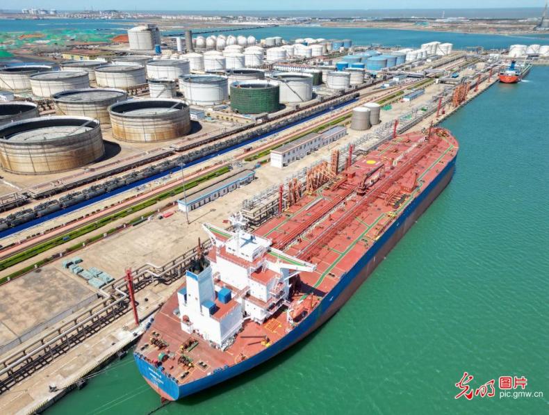 2023年4月7日,山東港口煙臺(tái)港,一艘大型油輪正在卸油。煙臺(tái)港推進(jìn)西港區(qū)LNG等項(xiàng)目的施工建設(shè),增強(qiáng)港口的能源物流儲(chǔ)備和輸送能力,以更高的儲(chǔ)運(yùn)效率保障能源供應(yīng)鏈穩(wěn)定暢通。(唐克攝/光明圖片)
