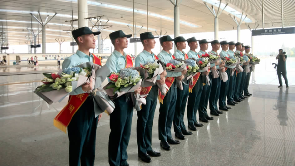 當(dāng)天下午3點(diǎn)35分,隨著G31次列車(chē)駛?cè)牒贾輺|站,13位參加閱兵式的隊(duì)員們依次下車(chē)??匆?jiàn)丈夫歐陽(yáng)哲的那一刻,金鑫和丈夫緊緊擁抱。一句“老公,你辛苦了!”飽含了這半年的思念。