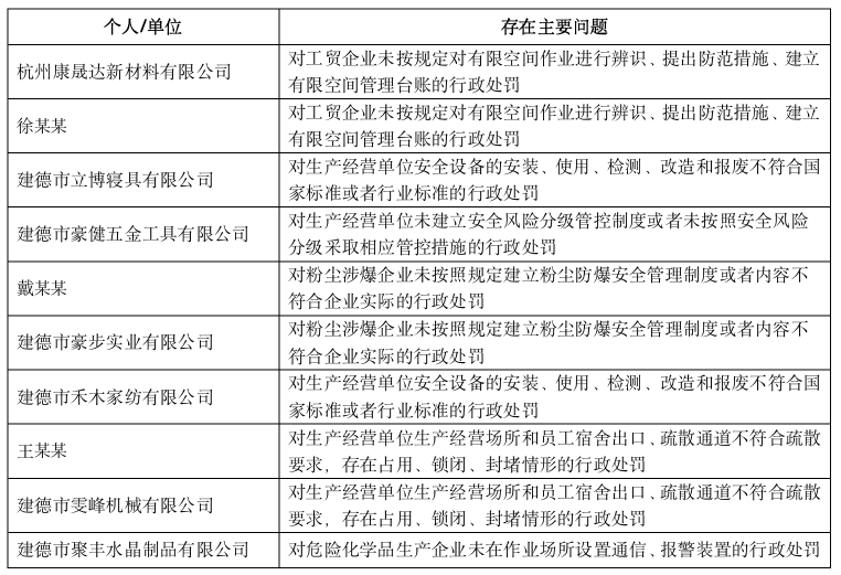 為嚴(yán)格落實(shí)生產(chǎn)經(jīng)營單位安全生產(chǎn)主體責(zé)任,依據(jù)《中華人民共和國安全生產(chǎn)法》及相關(guān)法律法規(guī),建德市應(yīng)急管理局現(xiàn)對安全生產(chǎn)隱患大排查大整治行動(dòng)中行政處罰相關(guān)案例進(jìn)行曝光。如發(fā)現(xiàn)企業(yè)安全生產(chǎn)隱患問題,請撥打12350舉報(bào)熱線,或建德市應(yīng)急管理局受理熱線0571-64780271。