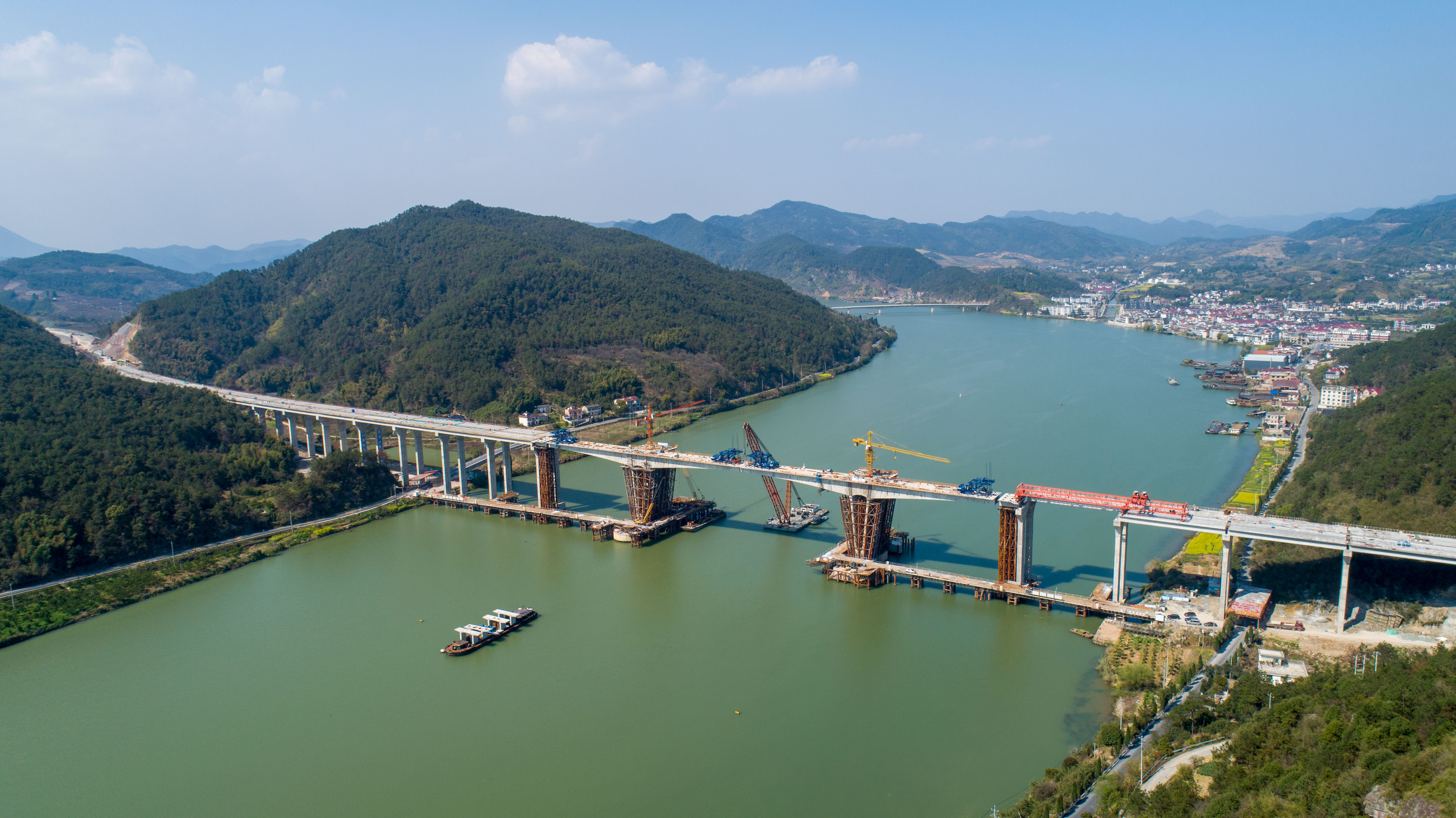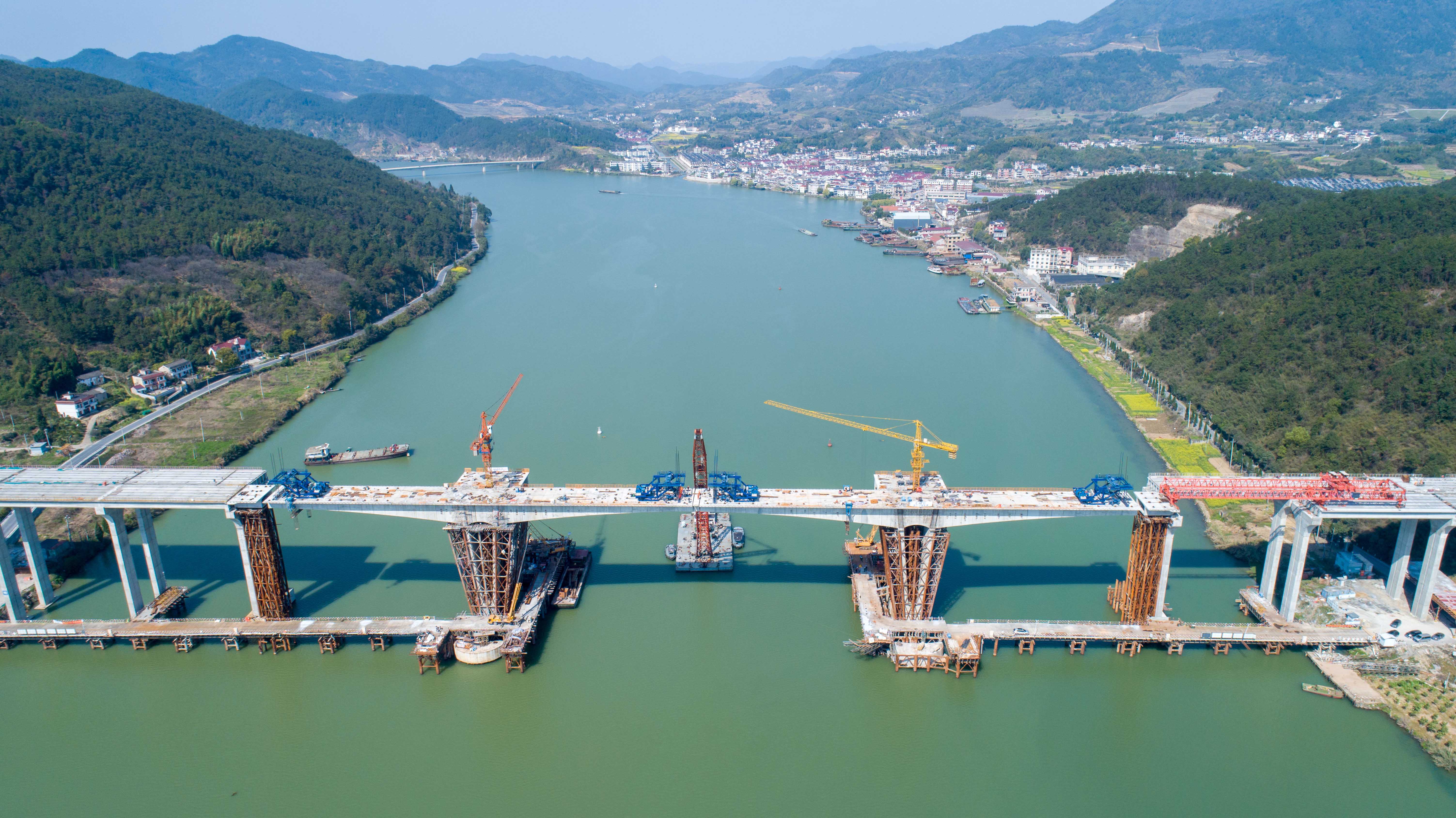 3月19日,重達(dá)50噸的20號塊節(jié)段梁拼裝完成,浙江省交通集團(tuán)建金高速蘭江特大橋成功合龍。(記者 范勝利)