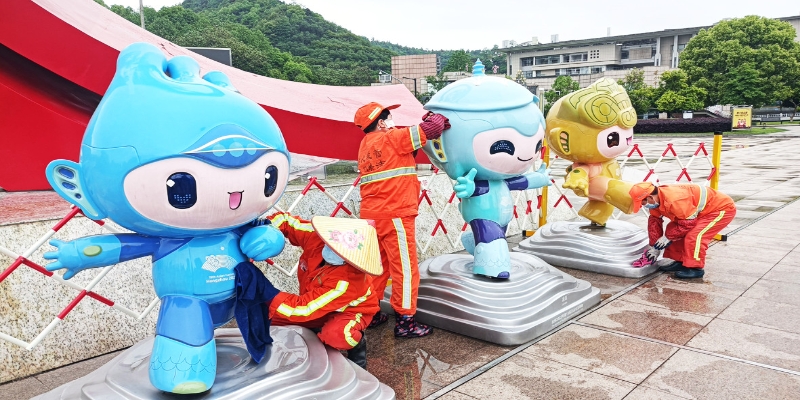 在“五一”國際勞動節(jié)即將來臨之際,新安物業(yè)管理有限公司組織環(huán)衛(wèi)工人認(rèn)真開展環(huán)境大整治活動,全力保障城區(qū)環(huán)境干凈整潔。圖為環(huán)衛(wèi)工人正在清洗杭州亞運會吉祥物等“城市家具”,擦亮“城市名片”。