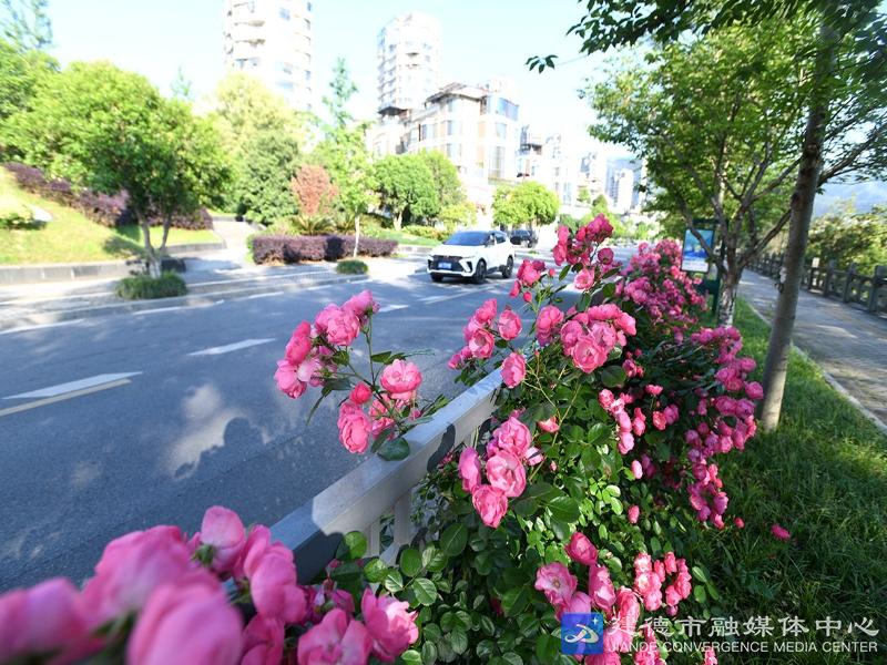 眼下正是月季的盛花期,在新安江城區(qū)的江濱中路上,姹紫嫣紅的月季花迎風(fēng)搖曳,一路繁花、一路芬芳,成為市民眼中一道亮麗的風(fēng)景線。