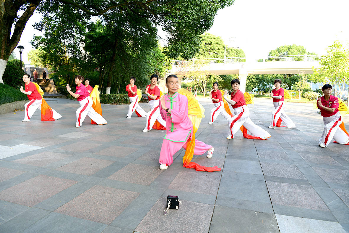 8月7日清晨,我市廣大健身愛好者開展了豐富多樣的全民健身活動,迎接第16個(gè)“全民健身日”的到來。圖為新安江街道葉家社區(qū)木蘭隊(duì)健身愛好者在習(xí)練五彩木蘭扇。