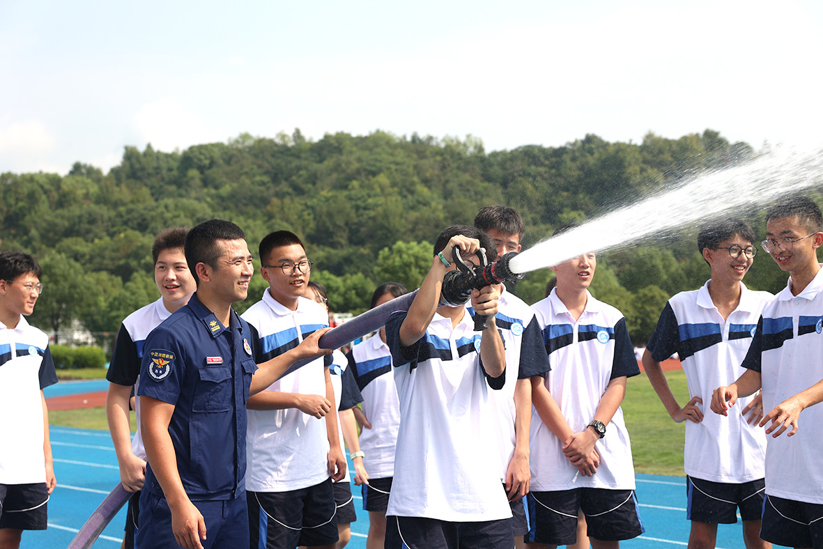 上午8時(shí)許,隨著模擬煙霧升起,新安江中學(xué)高一新生們捂住口鼻,俯下身軀,有序從寢室中撤離至空曠地帶。操場上,消防員們?yōu)槿w新生科普了火災(zāi)預(yù)防、自救互救的基本知識(shí),并邀請學(xué)生上前體驗(yàn)干粉滅火器及消防水槍的使用方式。