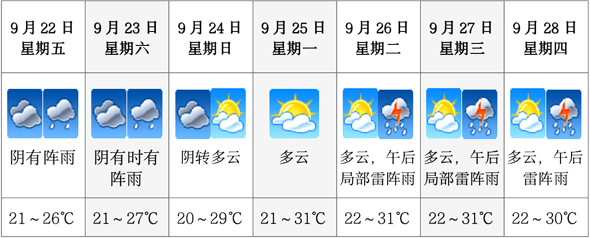 據(jù)市氣象臺分析,9月21日至22日,我市迎來一次分散性降水過程。伴隨著陰雨天氣,降溫將成為這個周末的“主角”,最低溫度在20—21℃。不過,夏天還沒走,9月25日—27日隨著副熱帶高壓增強(qiáng),在其控制下,天氣以多云為主,最高氣溫又將上升到30℃左右。而且由于副高邊緣不穩(wěn)定,還存在午后短時陣雨或雷雨的可能。