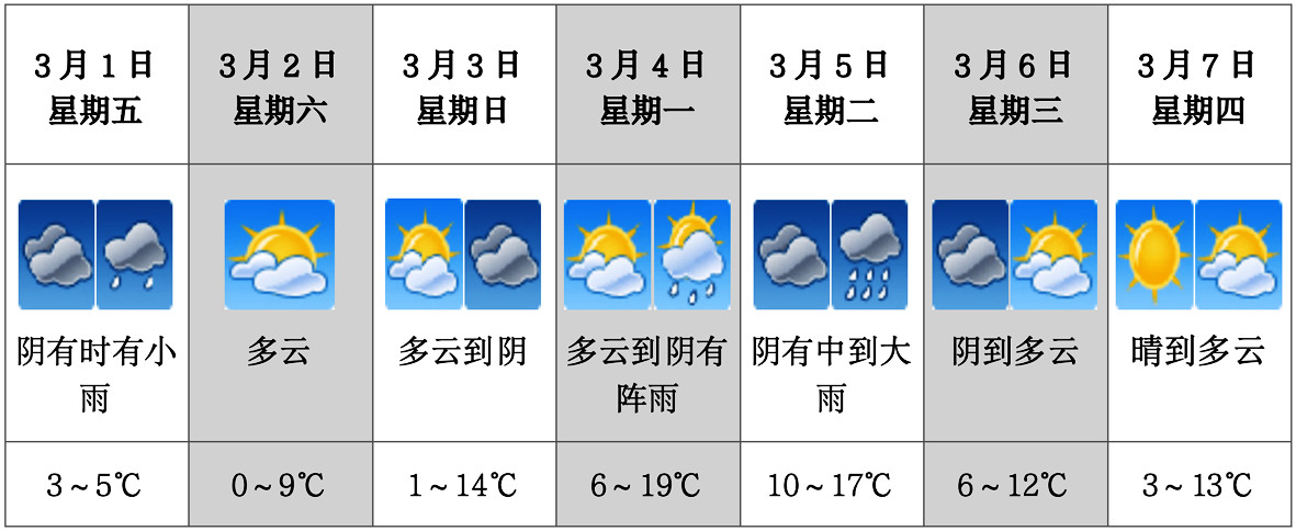昨日上午,隨著強(qiáng)降水區(qū)逐漸南移,雨勢(shì)逐漸減弱。下午,一股冷空氣自北而南繼續(xù)影響我市,各地氣溫相繼下降。據(jù)市氣象臺(tái)預(yù)計(jì),受冷暖氣流交匯影響,未來(lái)七天我市仍多陰雨天氣,3月4日—5日還有一次較明顯的降雨過(guò)程,氣溫起伏較大。其中3月2—3日最低氣溫0~1℃,山區(qū)0~-2℃,有冰凍,3日白天起氣溫顯著上升,4日最高氣溫可達(dá)19℃,5日起受冷空氣影響,氣溫將明顯下降。