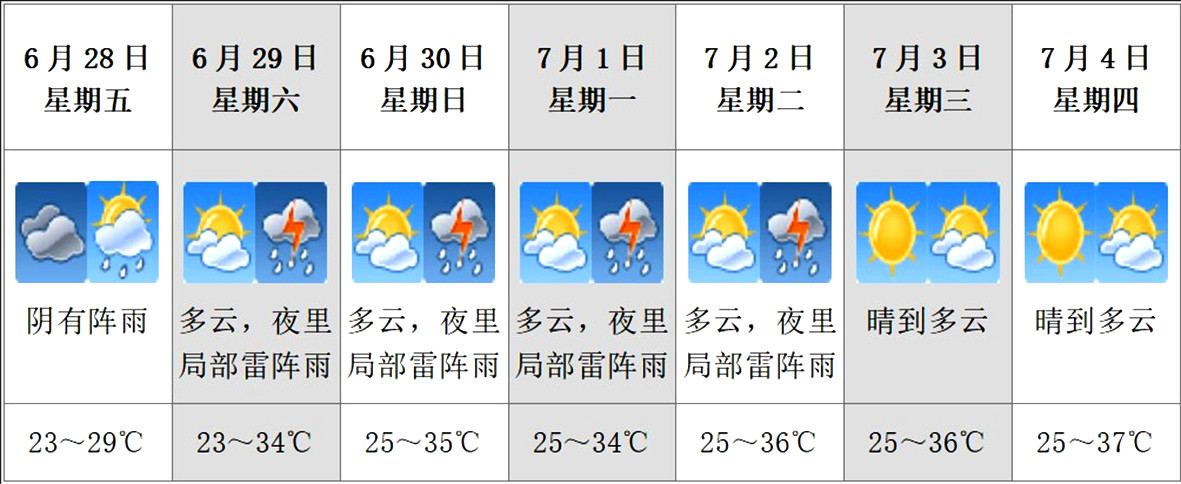 值得關(guān)注的是,從明天開始,隨著副熱帶高壓的逐漸增強(qiáng)并向北推進(jìn),我市天氣將轉(zhuǎn)變?yōu)榉稚⑿岳钻囉?,局部地區(qū)可能出現(xiàn)短時(shí)強(qiáng)降水等對(duì)流性天氣。同時(shí)氣溫也有所回升,最高氣溫在34—37℃之間。