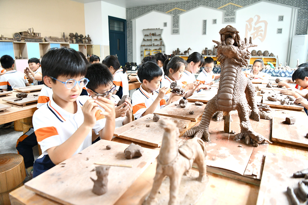 新學(xué)期以來(lái),明鏡小學(xué)將陶泥教學(xué)作為美育拓展性課程,讓學(xué)生們從中尋找創(chuàng)作的樂(lè)趣,緩解學(xué)習(xí)壓力,同時(shí)培養(yǎng)他們的動(dòng)手實(shí)踐、思維創(chuàng)作能力,豐富課余學(xué)習(xí)生活。圖為明鏡小學(xué)的學(xué)生在專業(yè)陶泥老師指導(dǎo)下,根據(jù)自己的想象將陶泥捏成花朵、動(dòng)物、玩具等象形物品。