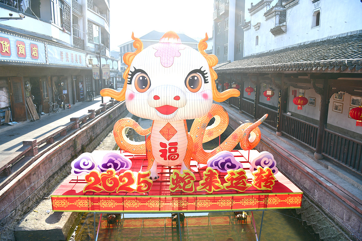 隨著新春臨近,壽昌古鎮(zhèn)對街景進(jìn)行了精心布置,迎春燈飾、小品亮相街頭,以嶄新的風(fēng)貌迎接蛇年新春。圖為西湖水街中央新布置的蛇年燈飾。