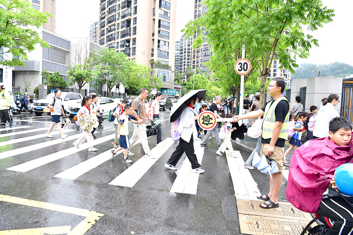 6月23日早上,在明珠小學(xué)與仁愛路交叉路口,一支由交警、老師、家長志愿者組成的護(hù)學(xué)隊伍,身穿黃馬甲,手持交通標(biāo)識牌,在雨中維持交通秩序,提醒過往車輛遵守交通規(guī)則,注意避讓學(xué)生,并引導(dǎo)學(xué)生在安全區(qū)域內(nèi)行走,避免交通事故的發(fā)生,守護(hù)孩子們的上學(xué)路。