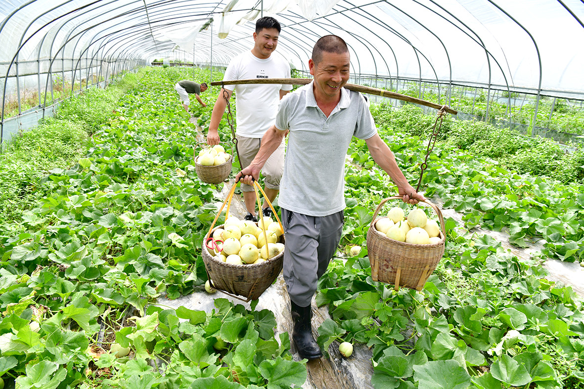 今年以來,楊村橋鎮(zhèn)長寧村對(duì)20多畝標(biāo)準(zhǔn)地采用“玉米+甜瓜+草莓”的輪作模式,通過統(tǒng)一種植、統(tǒng)一管理、統(tǒng)一銷售,帶動(dòng)周邊農(nóng)戶就業(yè)增收,為鄉(xiāng)村經(jīng)濟(jì)發(fā)展注入了新的活力。圖為村干部正在長寧村標(biāo)準(zhǔn)地里采摘成熟的甜瓜。