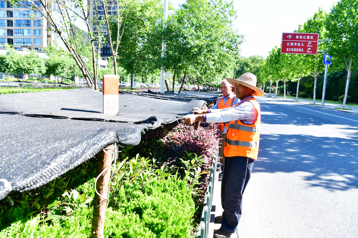 7月1日,記者在新安江體育館附近的道路沿線看到,建德市新園園林綠化工程有限公司的工人正忙著給綠化帶里的低矮綠植架起黑色遮陽網(wǎng),以抵御高溫炎熱天氣,確保綠化植物安然度夏。