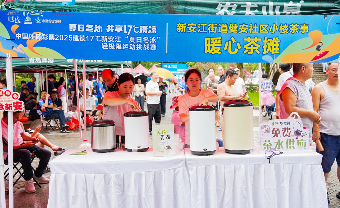 賽事當(dāng)天,新安江街道健安社區(qū)聯(lián)合紅領(lǐng)商圈愛(ài)心商家,在現(xiàn)場(chǎng)設(shè)置了免費(fèi)暖心姜茶、消暑涼茶供應(yīng)點(diǎn)。當(dāng)“耐寒勇士”們完成挑戰(zhàn)上岸后,一杯杯熱氣騰騰的姜茶遞到手中,驅(qū)散了江水中的寒意;在等待上場(chǎng)的間隙,清甜的消暑涼茶又為大家?guī)?lái)一絲沁人心脾的涼爽。這些看似微不足道的舉動(dòng),卻飽含著濃濃的關(guān)懷,讓遠(yuǎn)道而來(lái)的參賽者感受到家一般的溫暖。