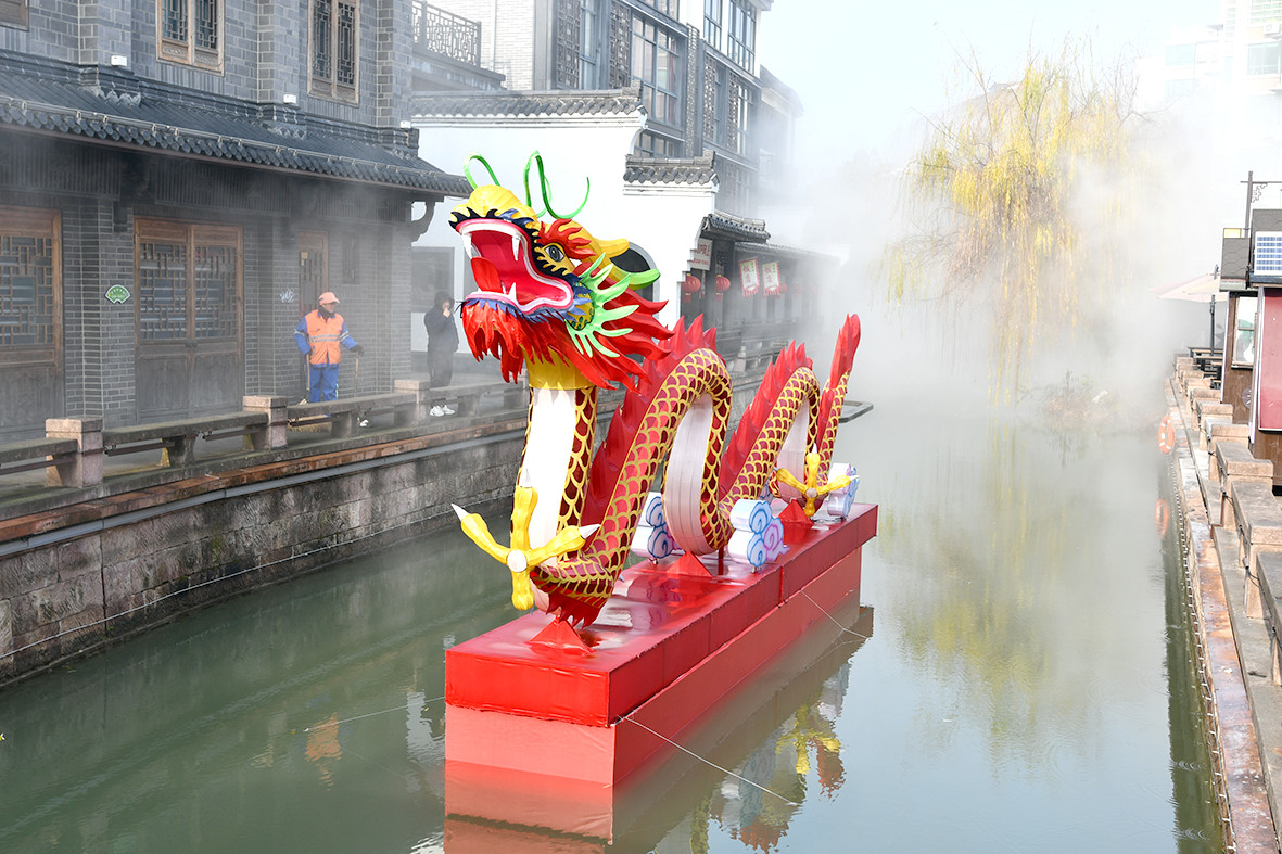 隨著龍年新春的臨近,壽昌鎮(zhèn)在西湖水街設置了龍燈模型,白天水霧升騰,晚上燈光璀璨,給古鎮(zhèn)增添了喜慶氛圍。