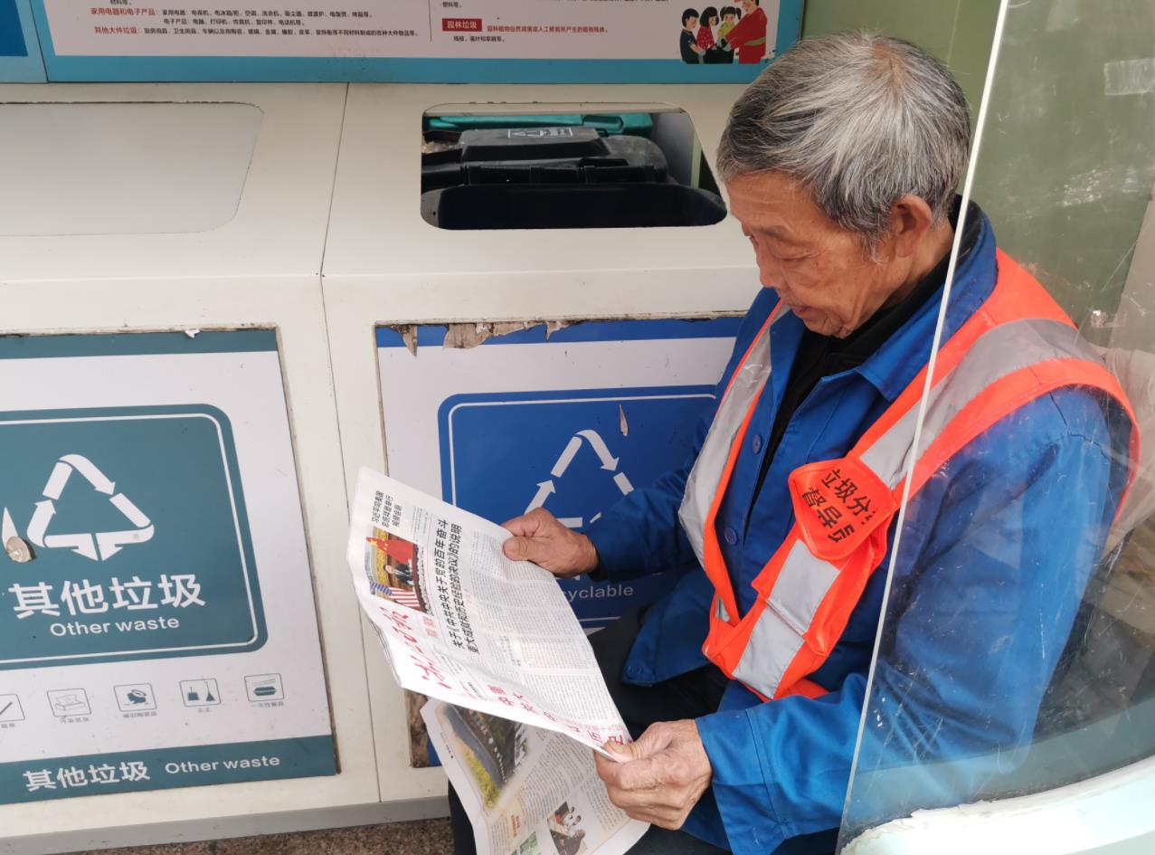11月18日清晨,新安江街道羅桐社區(qū)新林路垃圾分類點位上,垃圾分類督導員徐師父利用工作間隙正通過報紙學習黨的十九屆六中全會精神。